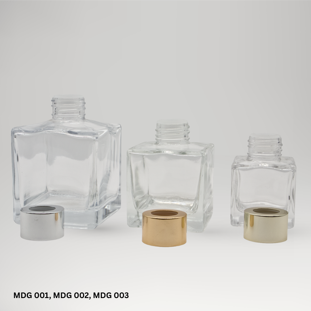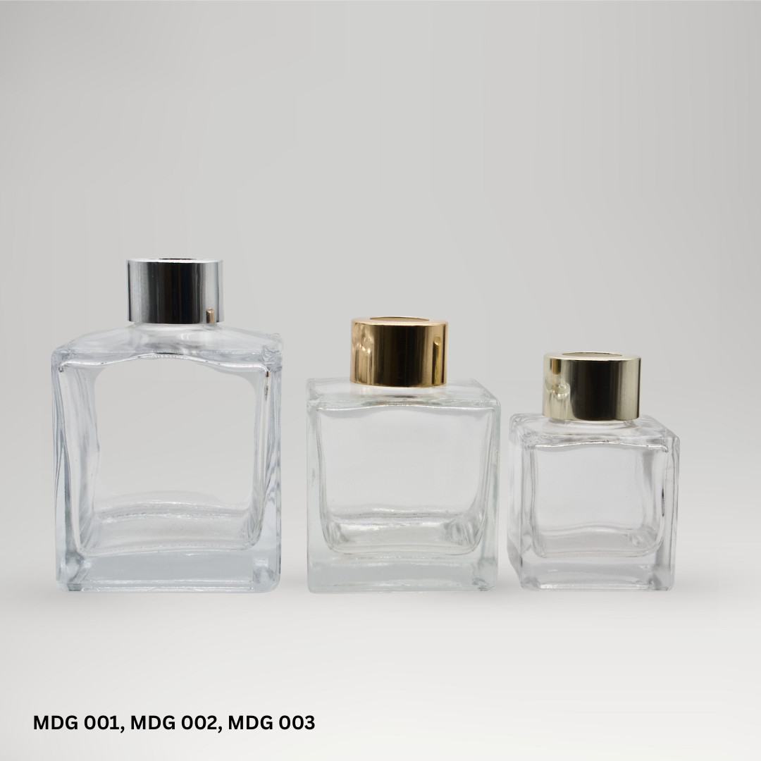 Square shape diffuser bottle range. Reeds and cap closure options are available as part of the complete pack.